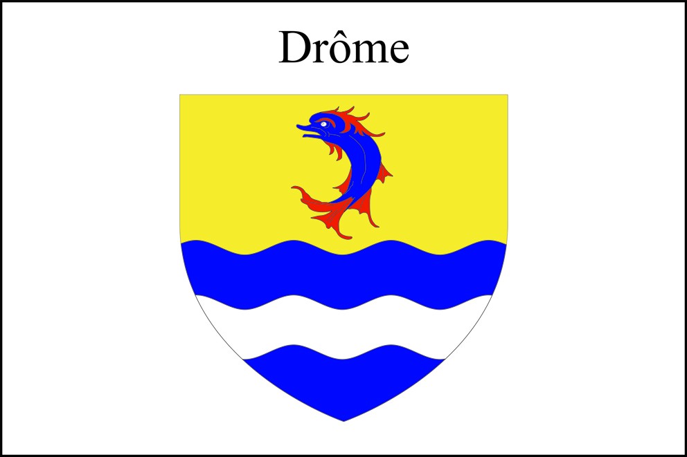 Le drapeau drômois est composé des couleurs suivantes : or, bleu et rouge. Il se caractérise par un dauphin d’azur, barbé, crêté, peautré, oreillé et lorré de gueules.