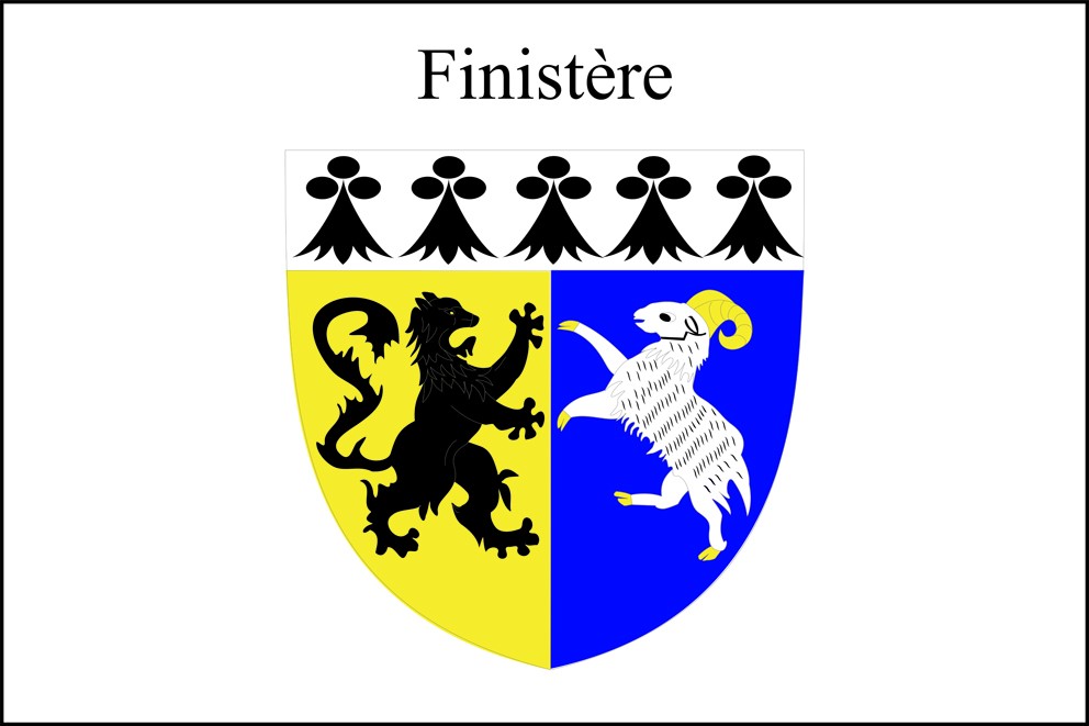 Le drapeau finistérien a les couleurs suivantes : noir, bleu, or et argent et se distingue en 1 d’or au lion contourné de sable, et en 2 d’azur au bélier saillant d’argent onglé et accorné d’or, au chef d’argent chargé de cinq mouchetures d’hermine de sable.