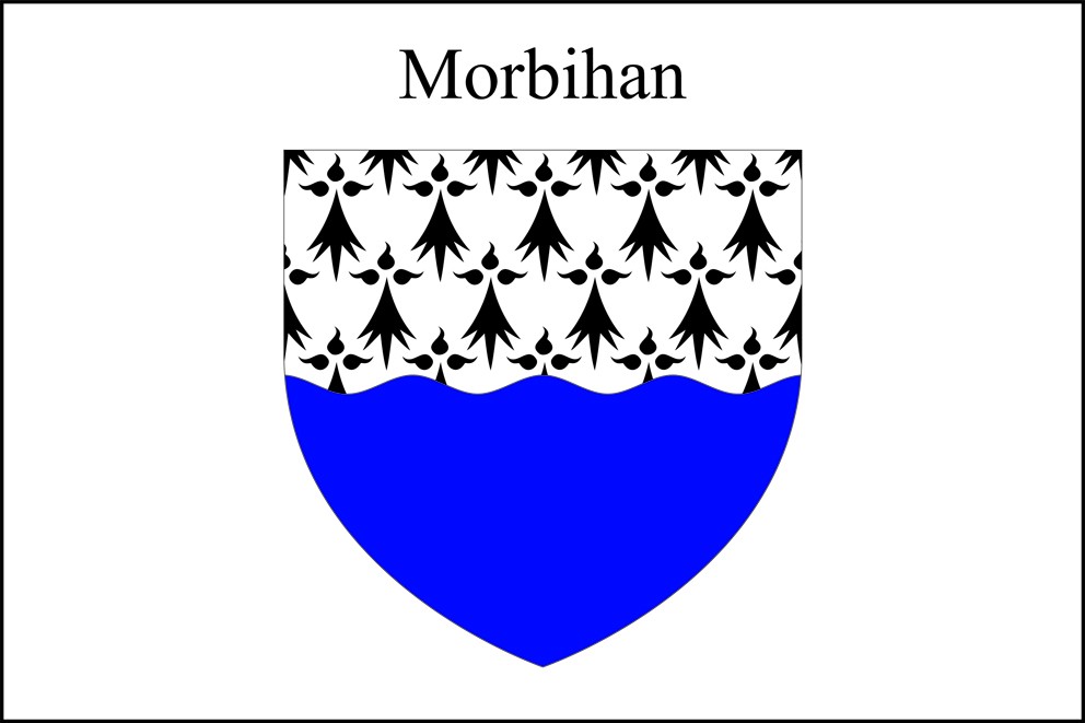 Ce drapeau morbihannais est composé des couleurs suivantes : bleu, blanc et noir et se distingue notamment car il est divisé en deux, la partie supérieure est blanche tachetée d’hermines et la partie inférieure est bleu azur.