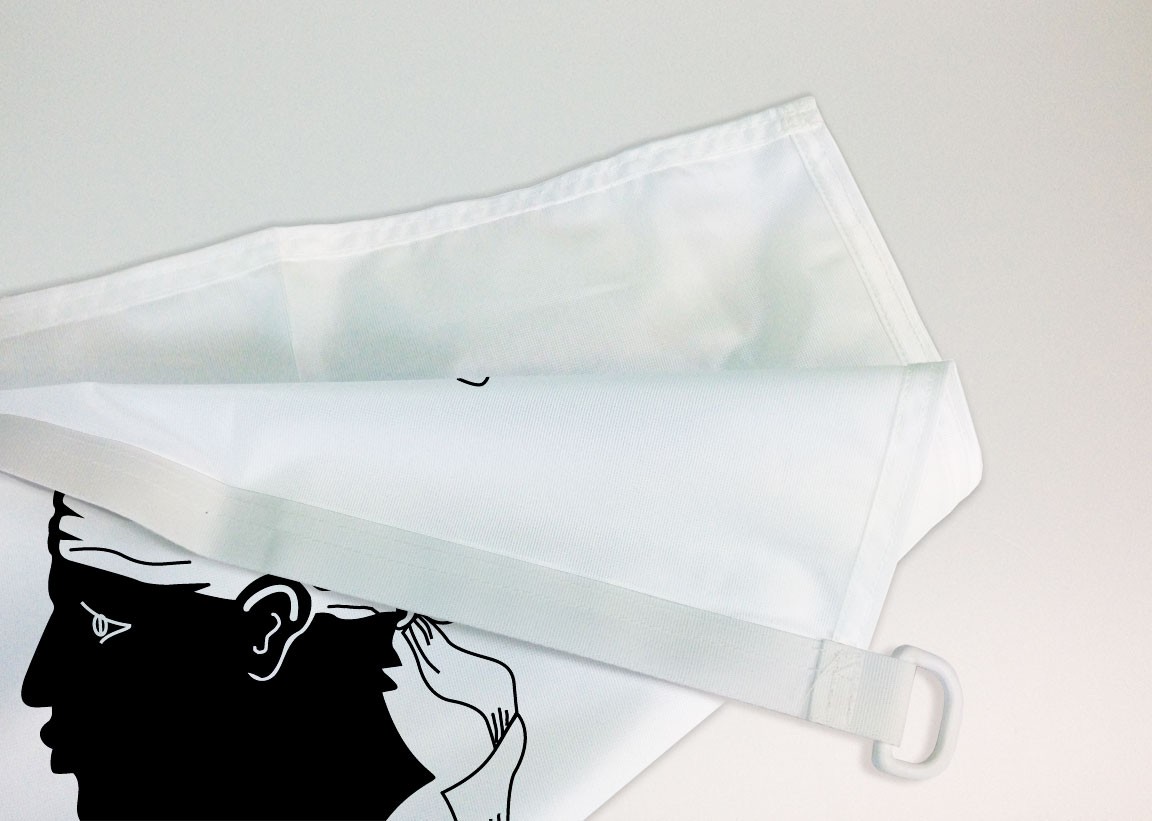 Le drapeau corse a un assemblage dit « pavillon » avec une sangle avec deux boucles plastiques. Il est destiné à être hissé au sommet d’un mât.