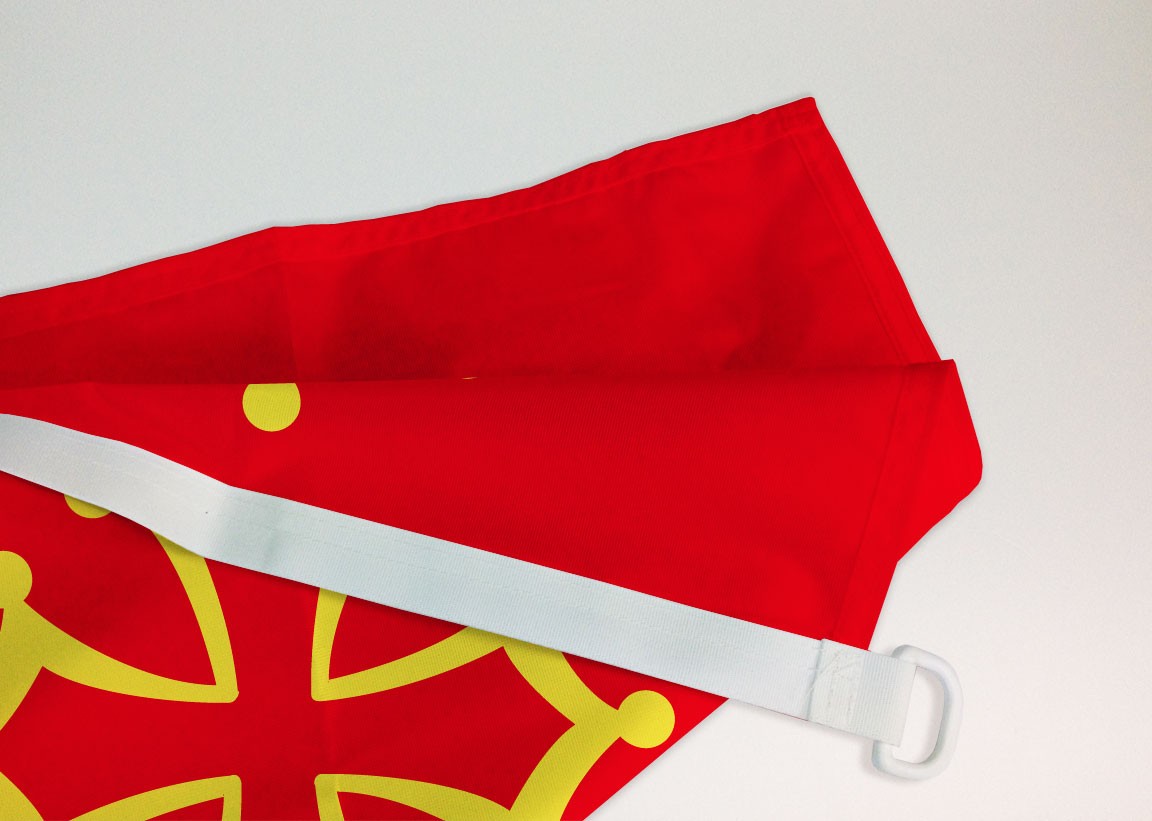 Le drapeau languedocien a un assemblage dit pavillon composé d’une sangle et deux anneaux en matière plastique. Il peut être monté au sommet d’un mât.