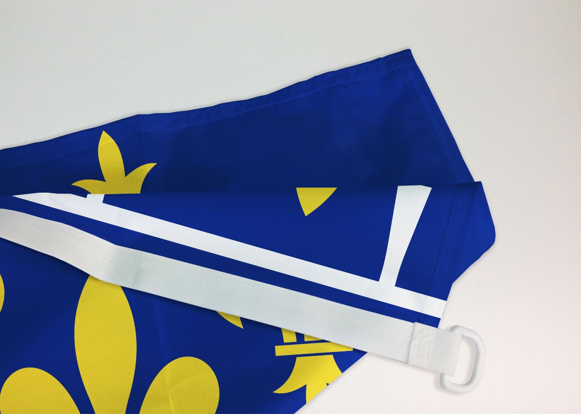 Ce drapeau orléanais a un montage parfois appelé « pavillon » avec une sangle avec une paire d’anneaux. Il est destiné à être hissé au sommet d’un mât.