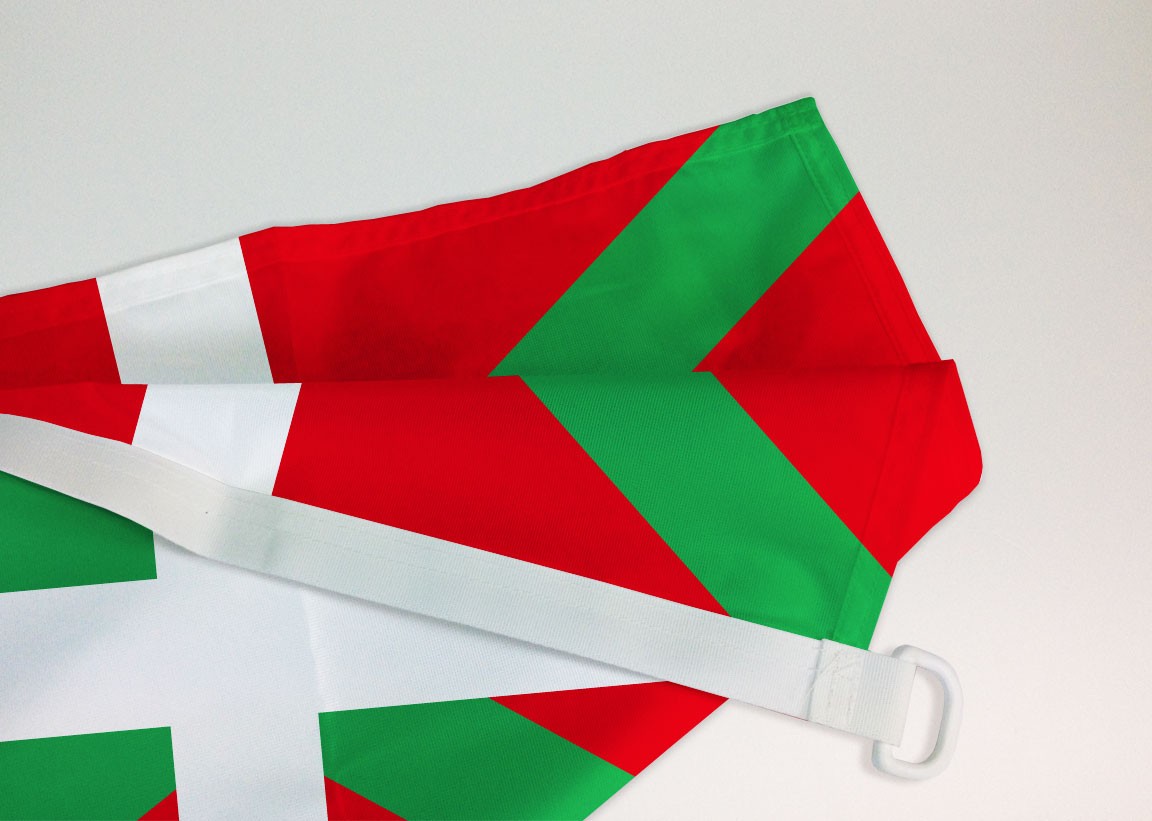 Ce drapeau basque appelé ikurriña a un assemblage dit en pavillon composé d’une sangle et deux anneaux de plastique. Il est destiné à être hissé sur un mât.