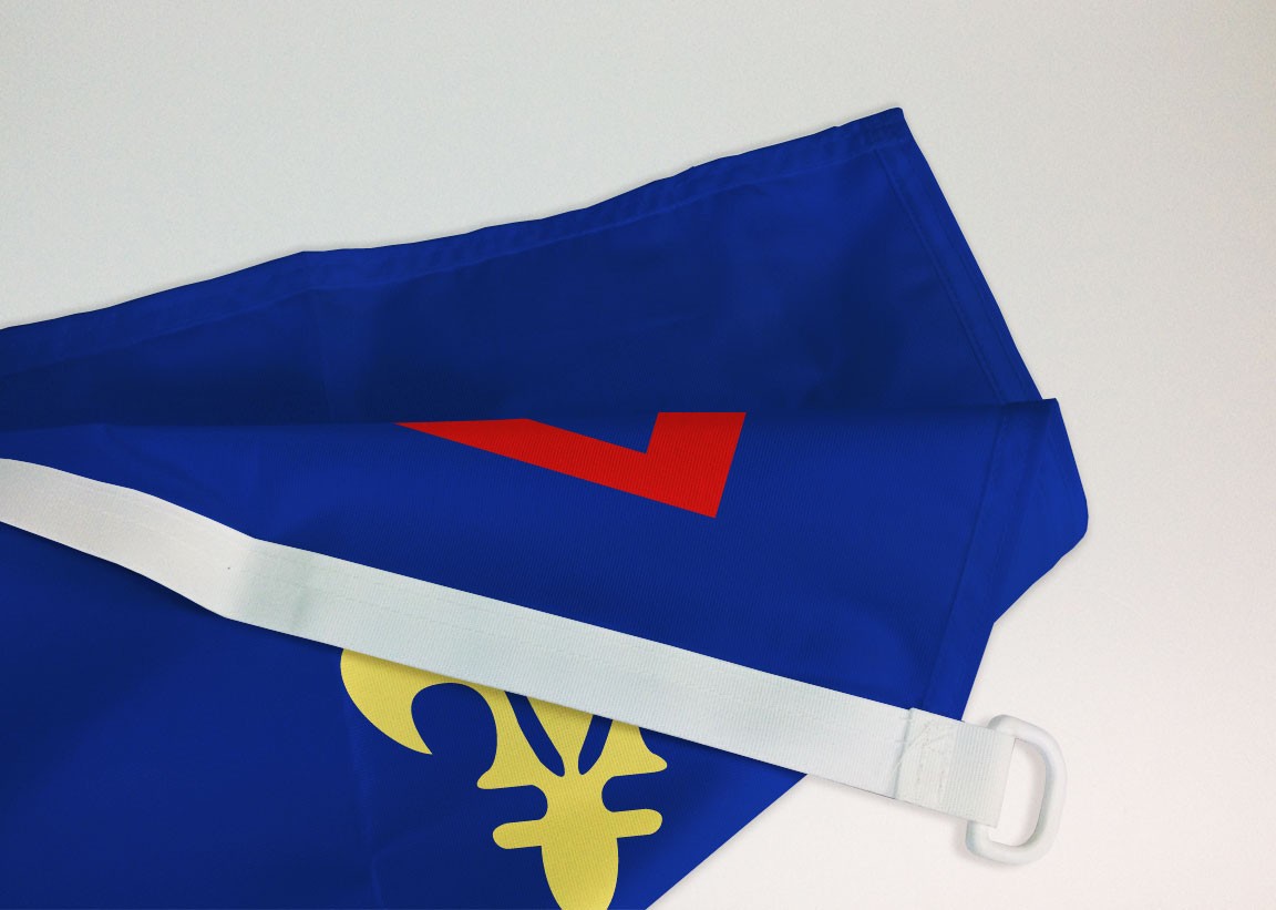 Ce drapeau provençal a un assemblage parfois appelé pavillon composé d’une sangle avec une paire d’anneaux en plastique. Il est destiné à être hissé sur un mât.