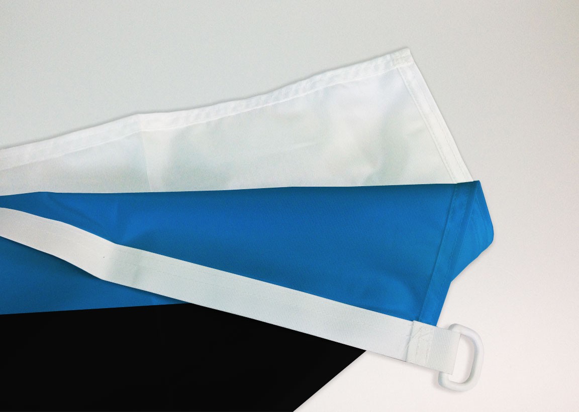 Ces drapeaux ne sont pas brut de coupe, le pourtour est ourlé (c’est une couture résistante), ce qui confère au tissu une excellente bonne résistance à la déchirure. Le tissu est maille soudée, permettant de limiter l’effet effiloché que l’on peut voir. Cette maille a plusieurs petits trous, elle n’est pas serrée. Cela permet de réaliser un tissu plus léger et en conséquence qui flotte mieux lorsqu’il y a un vent faible.