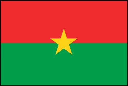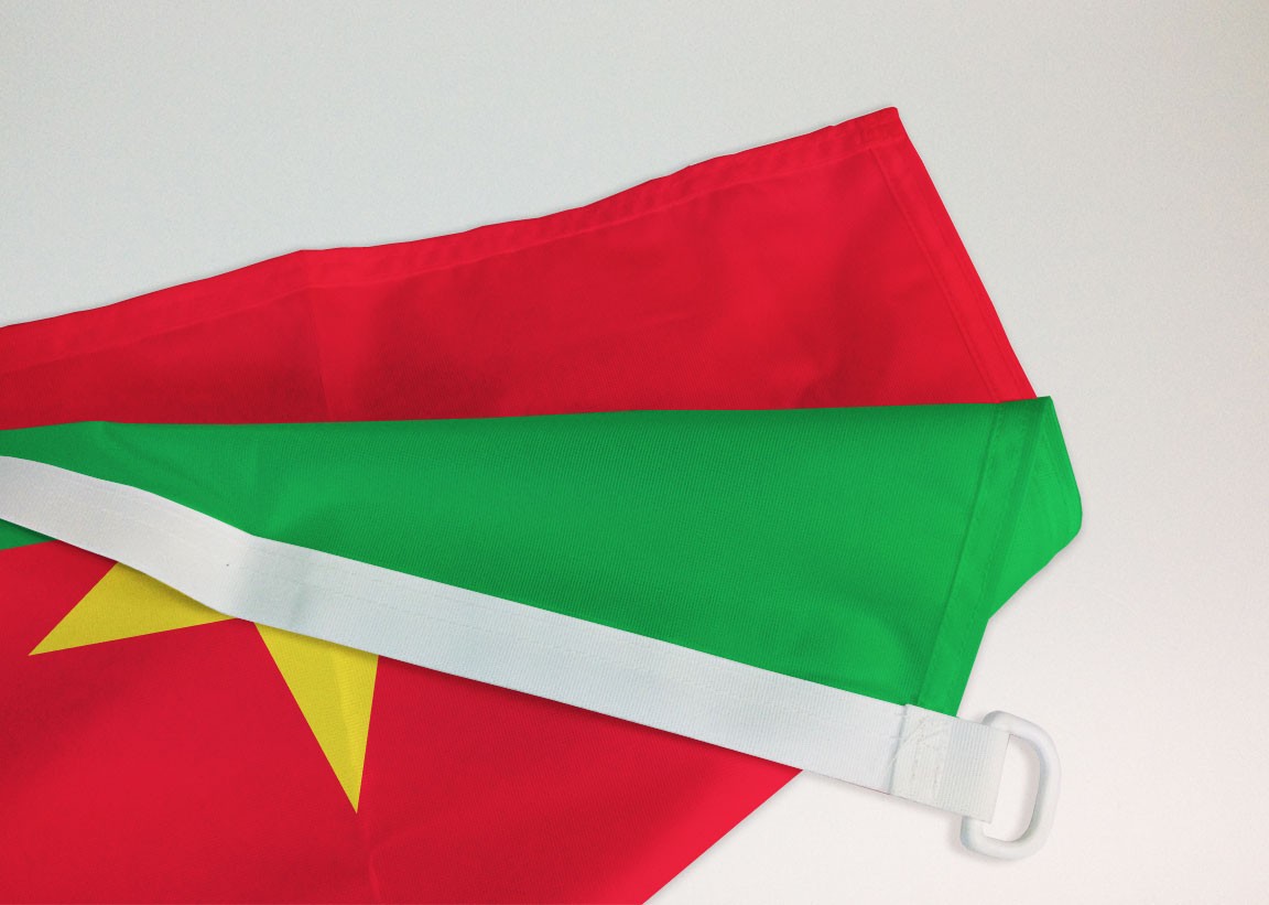 Ce drapeau burkinabé a un assemblage dit « pavillon » composé d’une sangle et une paire d’anneaux. Il peut être hissé au sommet d’un mât.
