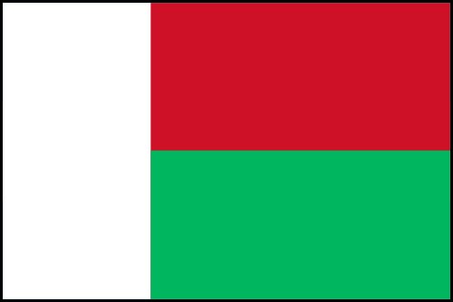 Le drapeau malgache a les couleurs suivantes : blanc, vert et rouge. Il se caractérise par une bande verticale blanche et de deux bandes horizontales rouge et verte.