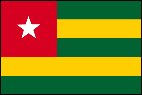 Le drapeau togolais est composé des couleurs suivantes : jaune rouge blanc vert. Il se distingue notamment par 5 bandes horizontales d’égale largeur.