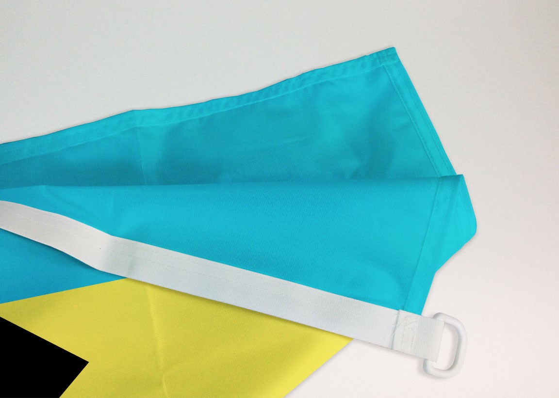 Le drapeau bahamien a un assemblage dit « pavillon » composé d’une sangle avec une paire d’anneaux en matière plastique. Il peut être hissé au sommet d’un mât.