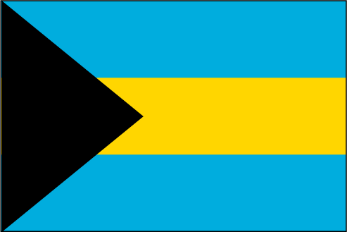 Ce drapeau bahamien est composé des couleurs suivantes : bleu, jaune et noir et se distingue par trois bandes horizontales, un triangle équilatéral noir se trouve du côté de la lance.