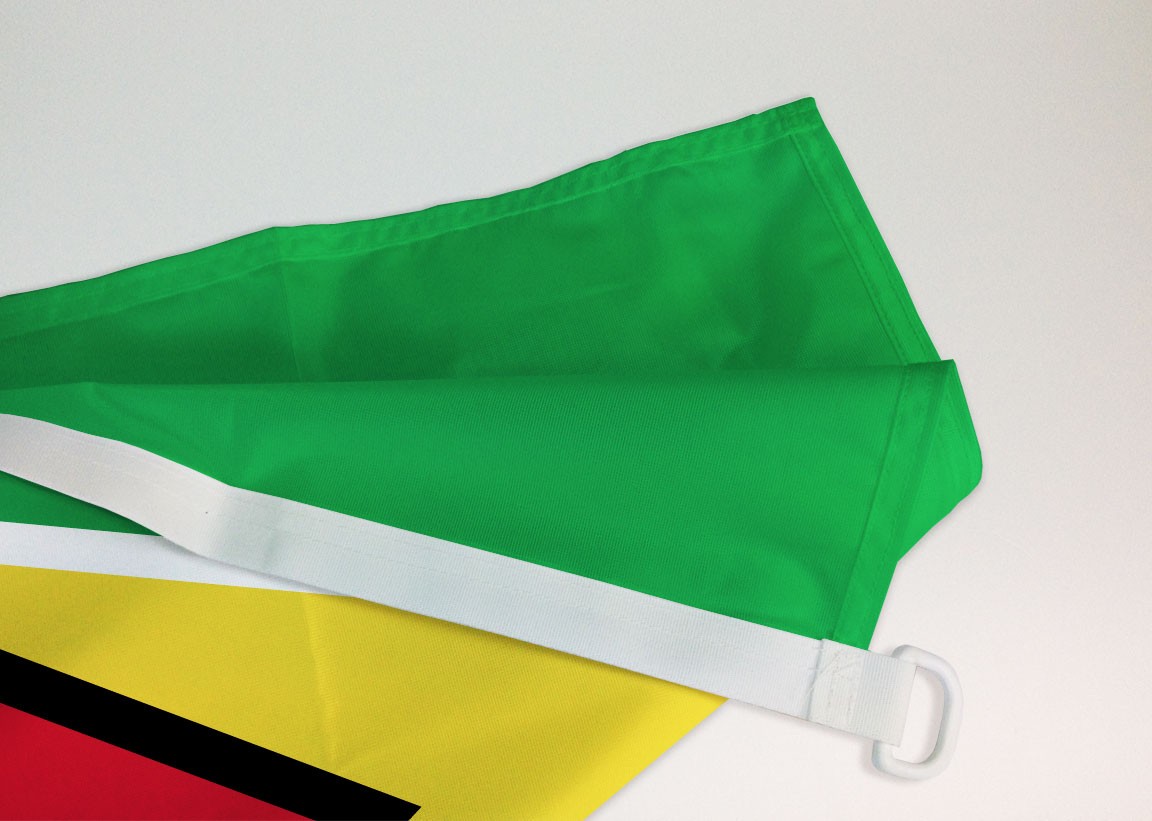 Le drapeau Guyanien a un assemblage dit « pavillon » composé d’une sangle et une paire d’anneaux. Il peut être hissé sur un mât.