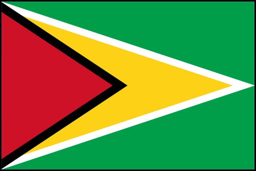 Ce drapeau Guyanien est composé des couleurs suivantes : rouge jaune et vert et se distingue par deux triangles, l’un vert et l’autre couleur or, frappé en son centre d’un pentacle rouge.
