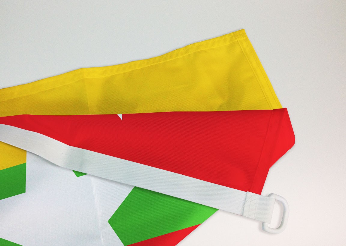 Les drapeaux ont le pourtour qui est fini par l’ourlet, ce qui donne au tissu une excellente bonne résistance à la déchirure. Le tissu est en maille soudée, ce qui permet d’éviter la déchirure que l’on aperçoit parfois. La maille a d’innombrables petits trous, elle n’est pas serrée. Ceci permet de réaliser un tissu plus léger et donc qui flotte plus lorsqu’il y a vent faible et également d’avoir une excellente résistance aux fortes rafales en opposant moins de résistance.