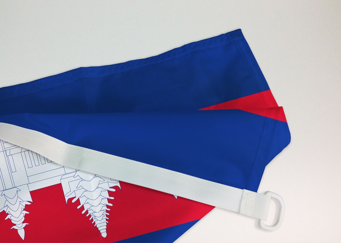 Le drapeau cambodgien a un assemblage appelé « pavillon » composé d’une sangle et deux boucles plastiques. Il peut être monté sur un mât.