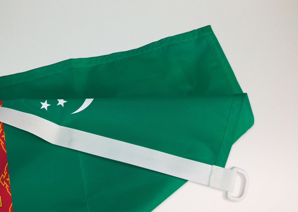 Ce drapeau turkmène a un assemblage parfois appelé « pavillon » composé d’une sangle et une paire d’accroches en matière plastique. Il est destiné à être monté au sommet d’un mât.