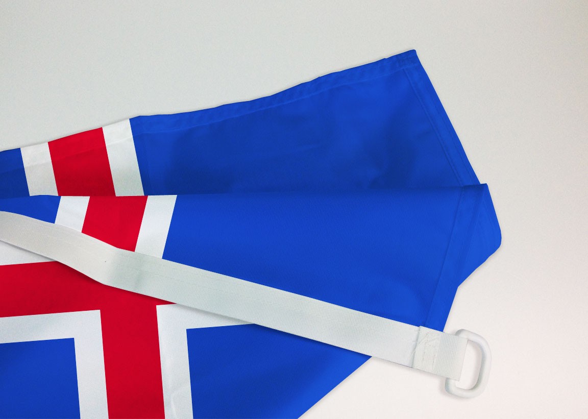 Le drapeau islandais connu sous le nom « Tjúgufáni » a un montage dit pavillon composé d’une sangle et deux boucles plastiques. Il peut être hissé au sommet d’un mât.