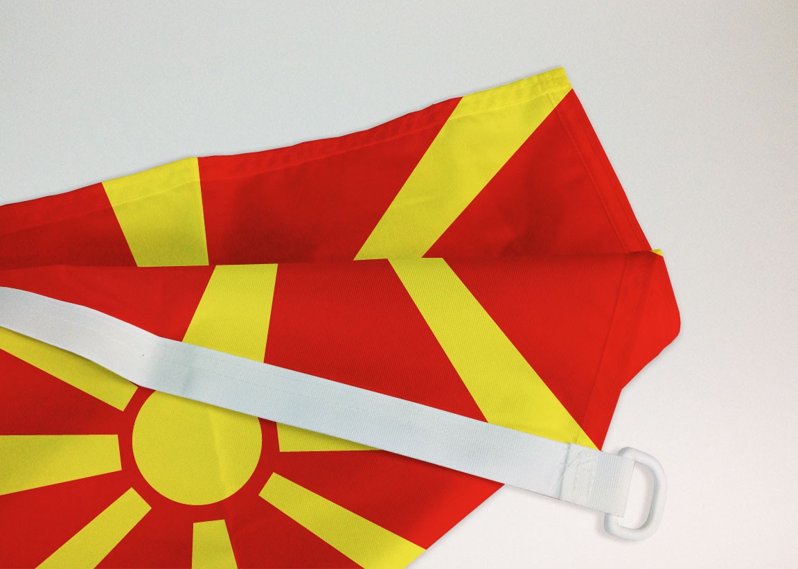Le drapeau macédonien a un montage appelé pavillon composé d’une sangle avec une paire d’anneaux de plastique. Il est destiné à être hissé au sommet d’un mât.