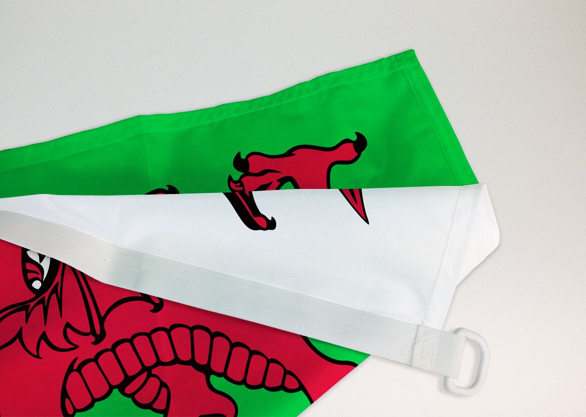 Le drapeau gallois a un assemblage appelé « pavillon », le Dragon rouge est composé d’une sangle avec deux boucles en plastiques. Il est destiné à être hissé au sommet d’un mât.