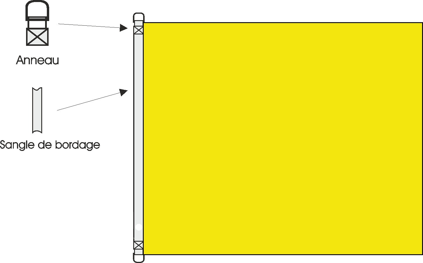 Maille 100% polyester 115 g/m2, ourlé sur 2 côtés, monté avec sangle et anneaux, destiné à être hissé en haut d’un mât.